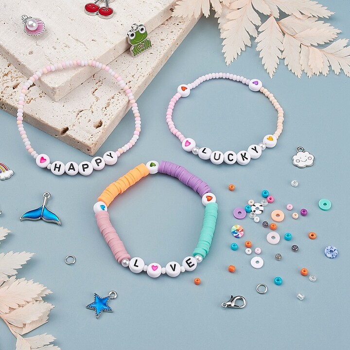 Margele lut polimeric Heishi 6x1mm (12 modele), margele plastic cu gaura mare (2 modele), margele plastic cu litere (150 buc.), margele de nisip 3mm (12 modele), charm-uri metalice (8 modele) si accesorii metalice - capat de nod, zale, inchizatoare