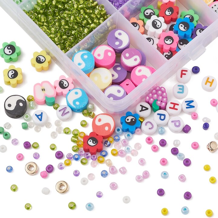Margele de nisip 3mm 18 culori, margele lut polimeric 60 buc., margele plastic cu litere 240 buc., distantiere plastic aurii 200 buc.