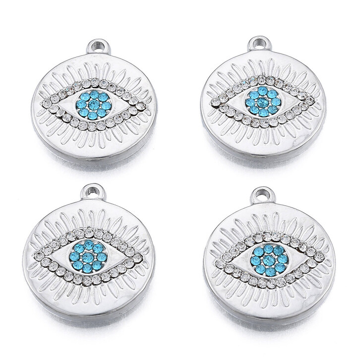 Charm otel inoxidabil 304, ochi cu strasuri albe si albastre - 21x18x2,5mm